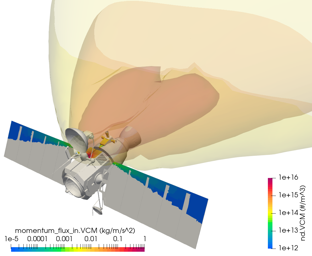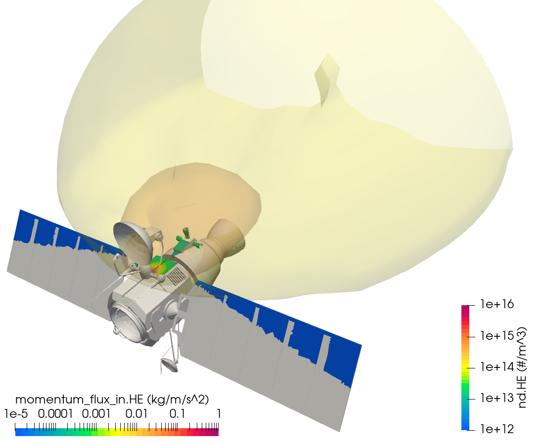 CTSP also implements the analytical plume model of M. Woronowicz. The example below shows volumetric plume densities and surface incident momentum flux for a heavier VCM and a lighter helium population.